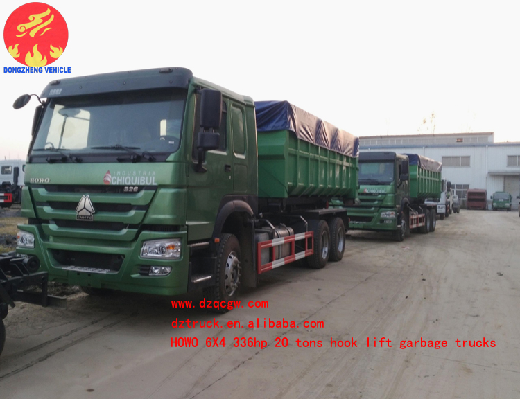 重汽豪沃重型勾臂垃圾车已调试并装运完毕,等待船期,即日准备发往港口。